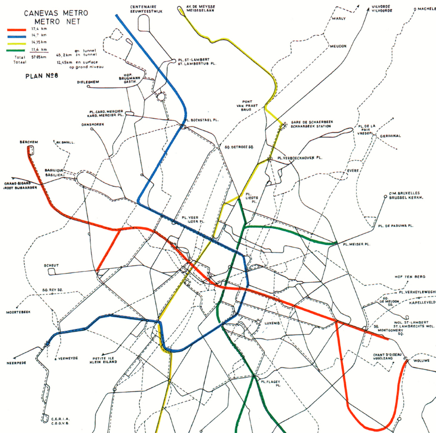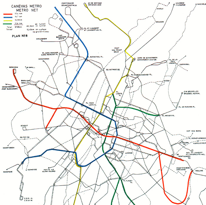 Projet de métro 1 et de pré-métro établi dès 1965 par le Ministère des Communications et la STIB. La ligne 1 devait être prolongée à l'ouest jusqu'à l'autoroute. L'axe nord-sud restait un pré-métro. Source : Le rail, clé de la mobilité à Bruxelles, op. cit., p. 213.